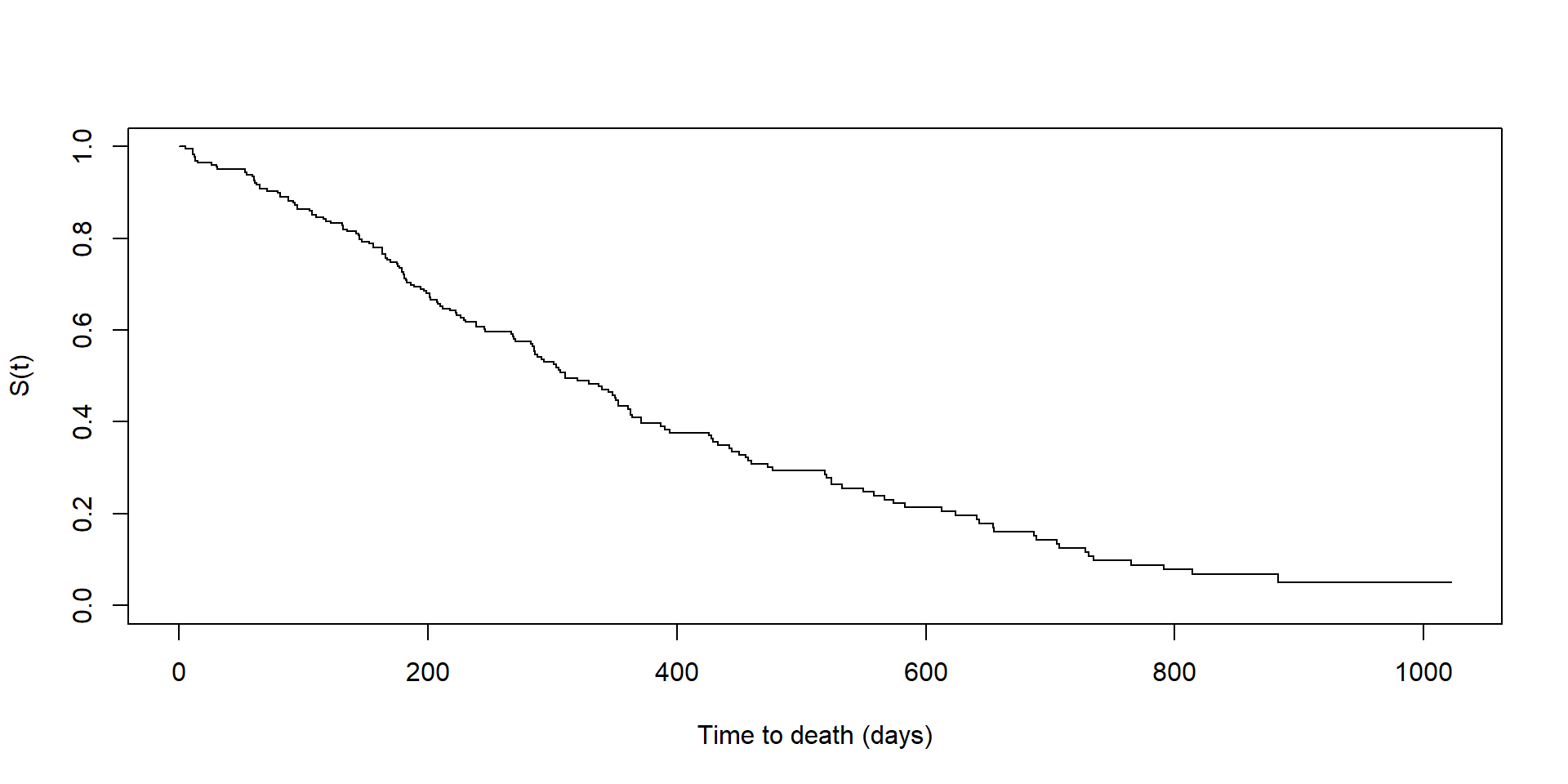 - Definition: \(S(t) = P(T > t) =\) probability that the event of interest occurs after time \(t\)