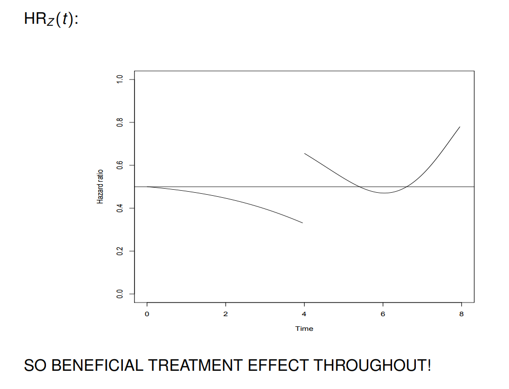 \] is the true hazard. One HR on \([0,4]\) (beneficial on this range) and another one on \((4,\tau [\) (no effect on this range).