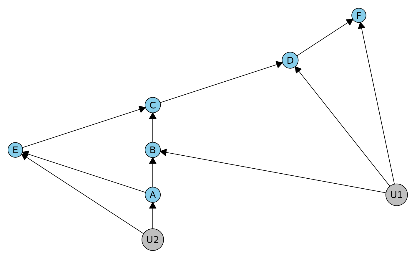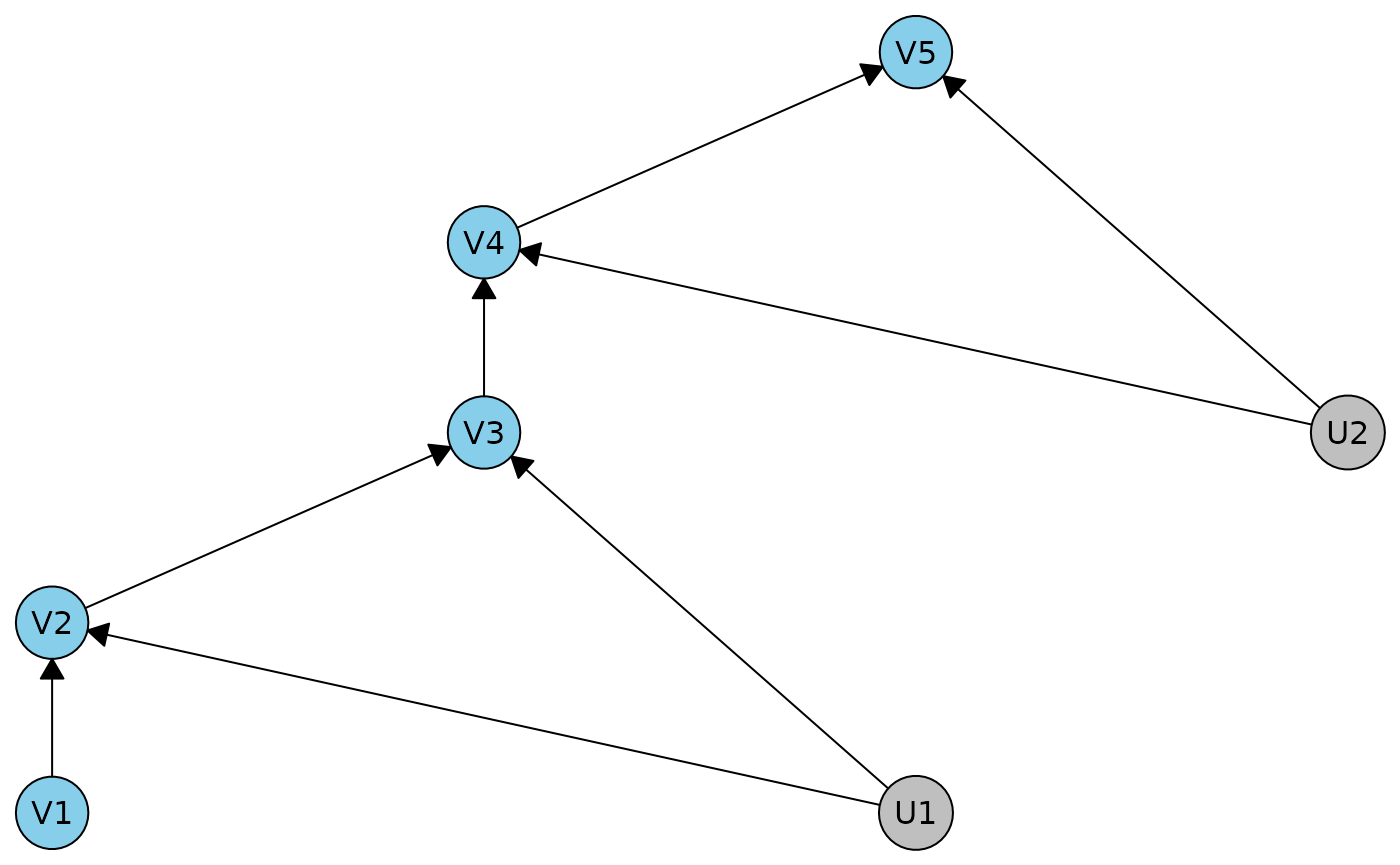 caugi. Our functiondhvmdoes some basic setup for Discrete Hidden Variables Models (dhvm), and by default assumes that any variable starting with a capital U is latent. The DAG is plotted, with latent variables indicated in grey.