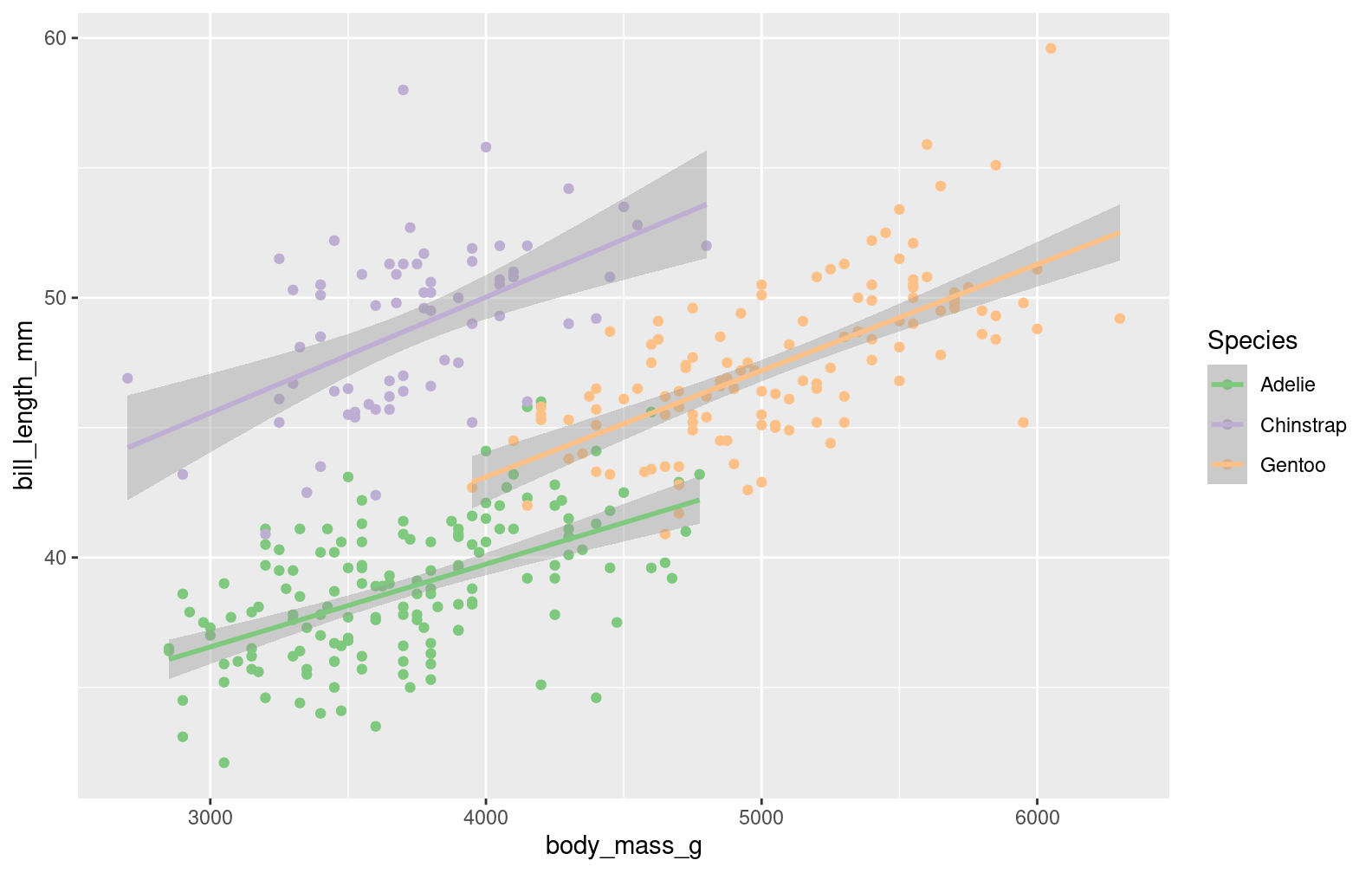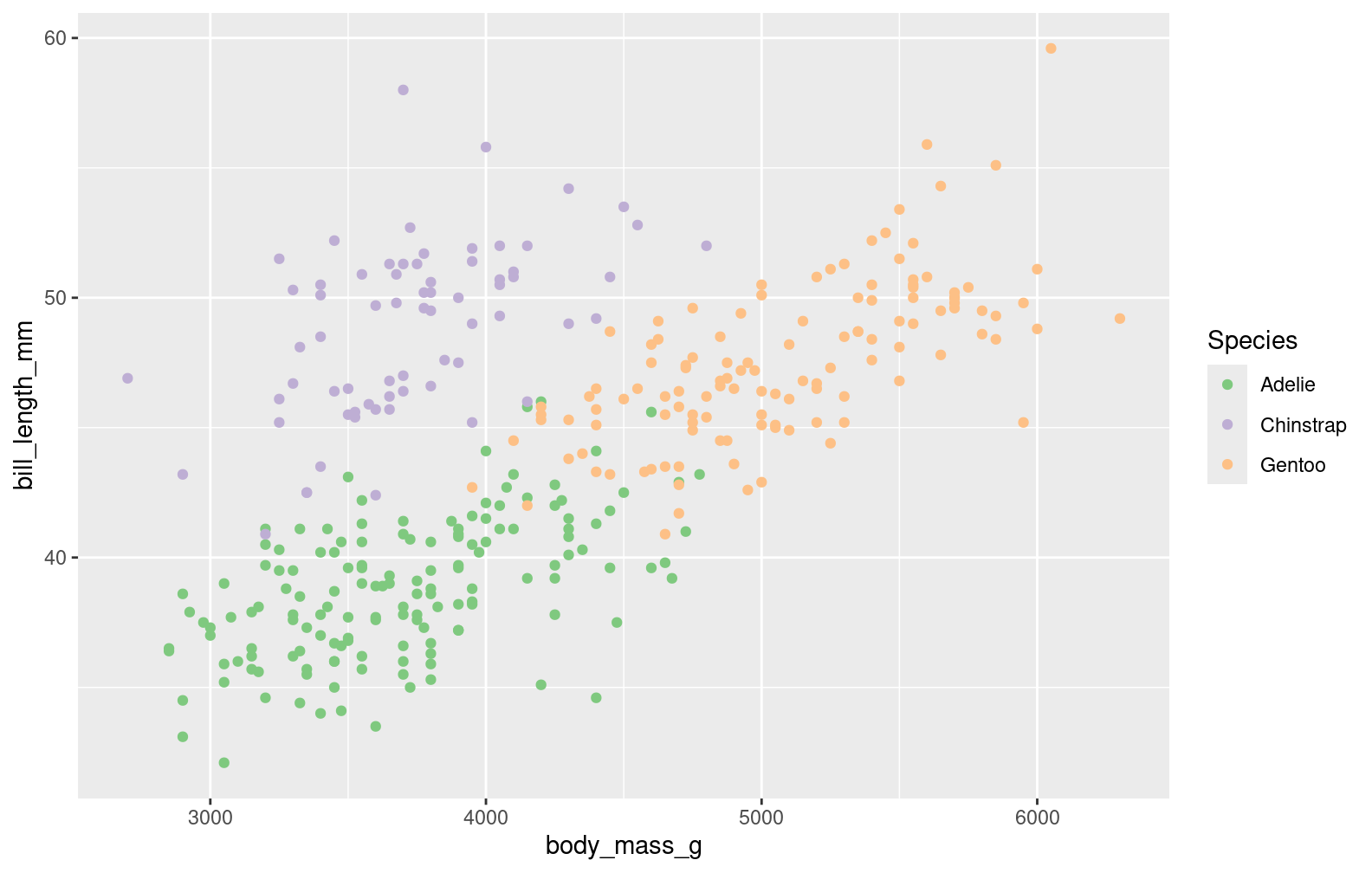 step1 <-ggplot(penguins, aes(x = body_mass_g, y = bill_length_mm, color = species))step1