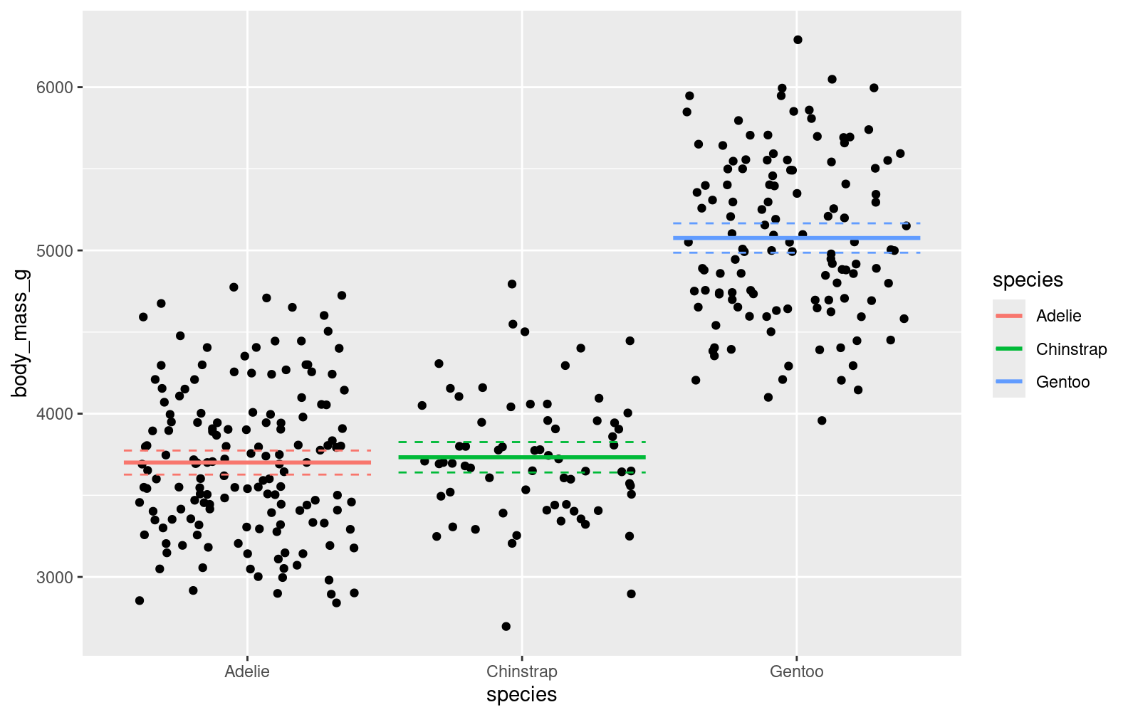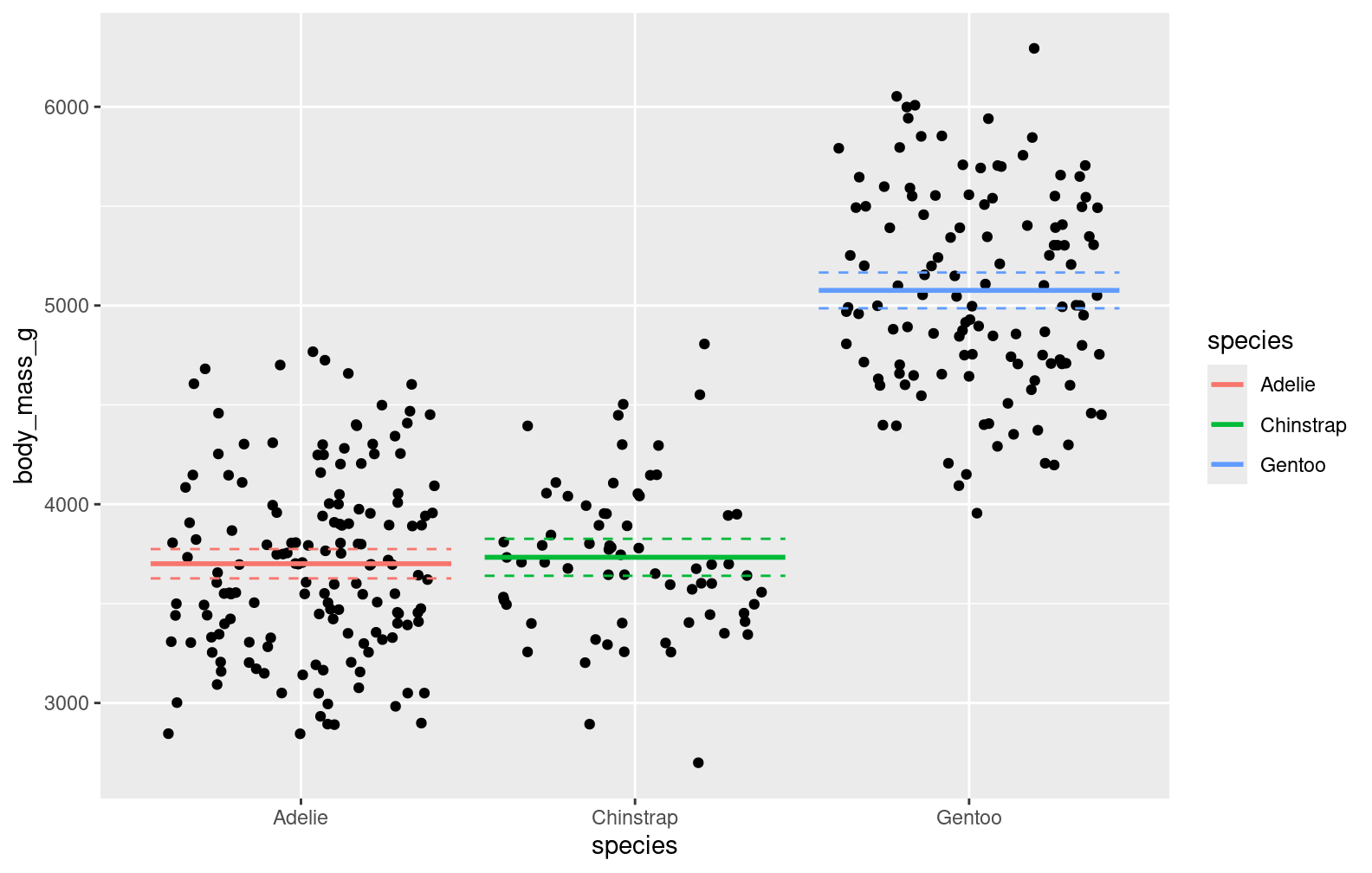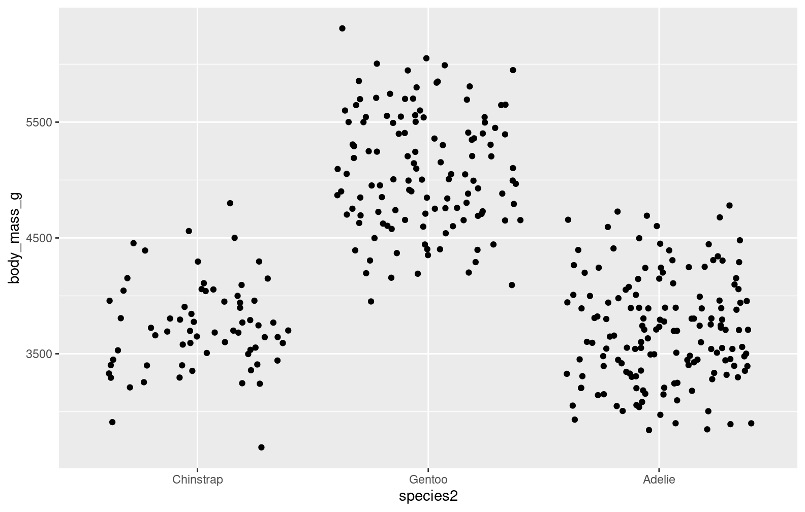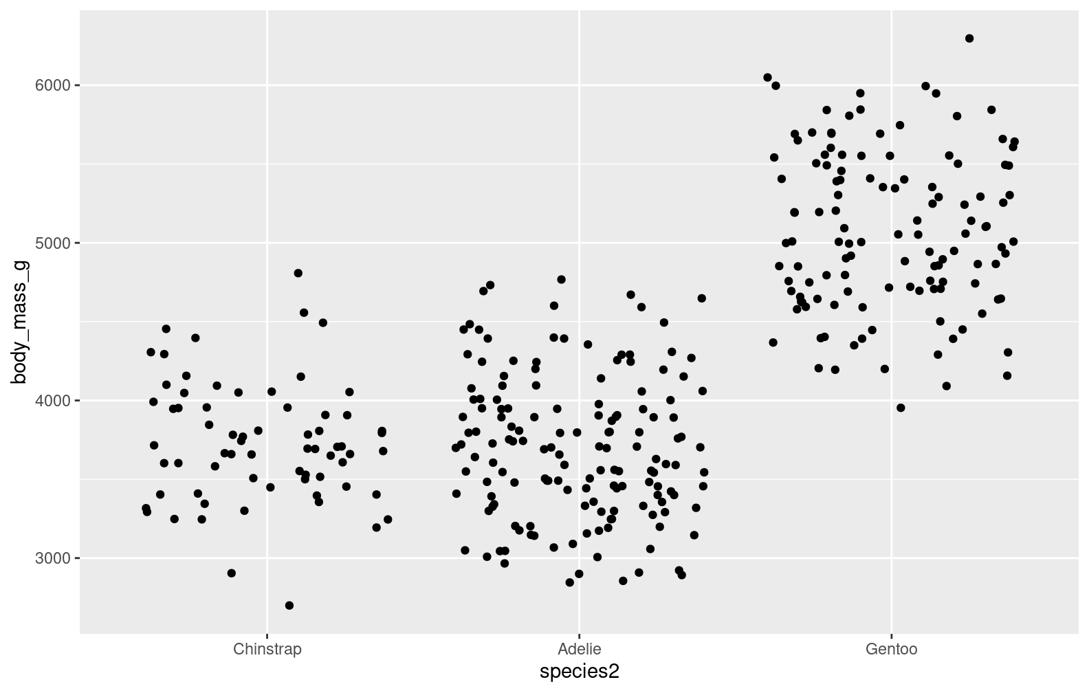 plot3 <-ggplot(penguins, aes(x = species, y = body_mass_g)) +geom_jitter()plot3