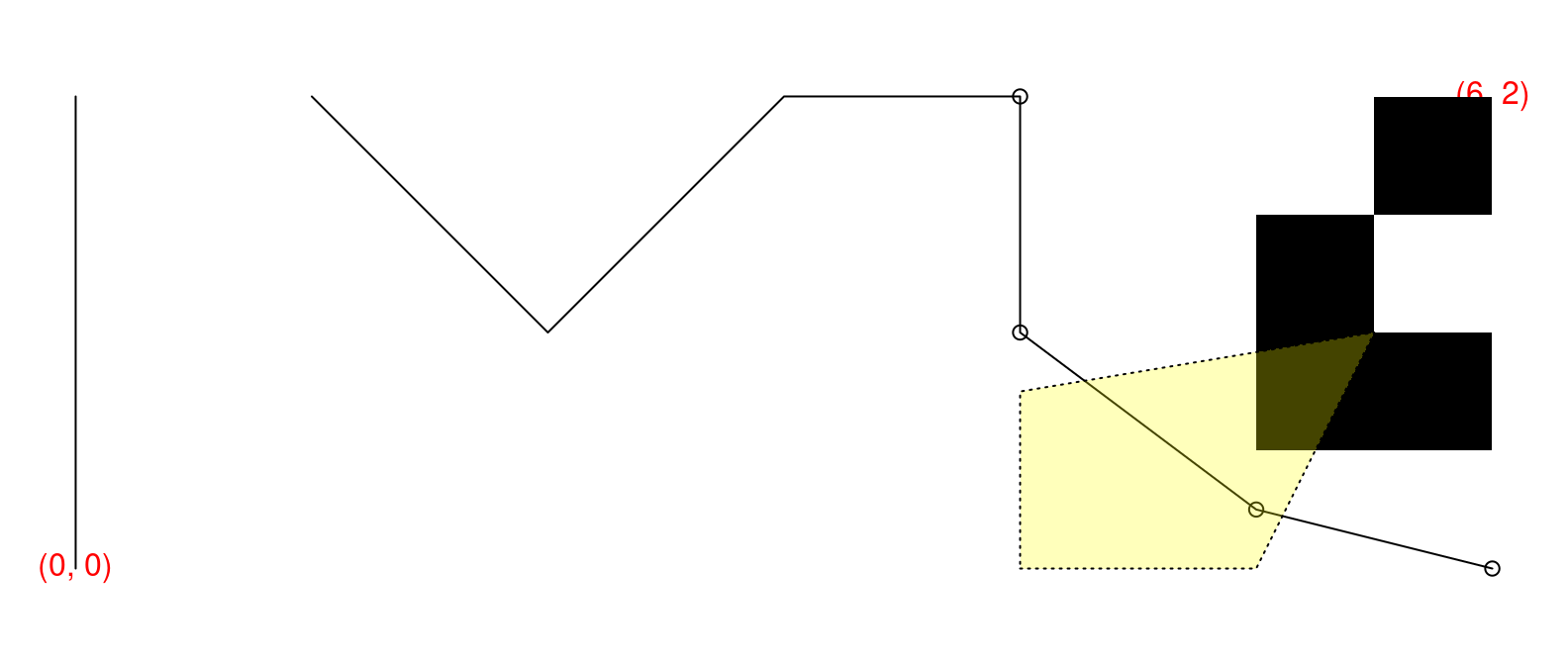 par(mar=rep(0.5, 4)) # small plot margins (bottom, left, top, right)plot.new() # start a new plotplot.window(c(0, 6), c(0, 2), asp=1) # x range: 0–6, y: 0–2; proportionalx <-c(0, 0, NA, 1, 2, 3, 4, 4, 5, 6)y <-c(0, 2, NA, 2, 1, 2, 2, 1, 0.25, 0)points(x[-(1:6)], y[-(1:6)]) # symbolslines(x, y) # line segmentstext(c(0, 6), c(0, 2), c("(0, 0)", "(6, 2)"), col="red") # two text labelsrasterImage(matrix(c(1, 0, # 2x3 pixel "image"; 0=black, 1=white0, 1,0, 0), byrow=TRUE, ncol=2),5, 0.5, 6, 2, # position: xleft, ybottom, xright, ytopinterpolate=FALSE)polygon(c(4, 5, 5.5, 4), # x coordinates of the verticesc(0, 0, 1, 0.75), # y coordinateslty="dotted", # border stylecol="#ffff0044"# fill colour: semi-transparent yellow)